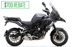 Offer good on all new and unregistered 2022 Benelli TRK502 models. Not all customers will qualify. The finance offer will only be available to credit qualified customers. $700 Rebate good on all new and unregistered 2022 Benelli TRK502 models ONLY. Rebate can only be used for this Benelli TRK502 purchase at the dealership and must be redeemed on the date of purchase. It has no cash value and is not transferable. Example: A total 48-month term with an Amount Financed of $6,400 and 3.99% APR requires monthly payments of $144.48 for 48 months after Rebate. Your actual monthly payment may differ based on financing terms, credit tier qualification, accessories or other factors such as down payment and fees. A 9.03% down payment is required to obtain advertised monthly payment of $144.48. Contact a participating Benelli/SSR dealer for details. Offer expires 03/31/2026.