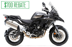 Offer good on all new and unregistered 2022 Benelli TRK502X models. Not all customers will qualify. The finance offer will only be available to credit qualified customers. $700 Rebate good on all new and unregistered 2022 Benelli TRK502X models ONLY. Rebate can only be used for this Benelli TRK502X purchase at the dealership and must be redeemed on the date of purchase. It has no cash value and is not transferable. Example: A total 48-month term with an Amount Financed of $6,400 and 3.99% APR requires monthly payments of $144.48 for 48 months after Rebate. Your actual monthly payment may differ based on financing terms, credit tier qualification, accessories or other factors such as down payment and fees. A 15.51% down payment is required to obtain advertised monthly payment of $144.48. Contact a participating Benelli/SSR dealer for details. Offer expires 03/31/2026.