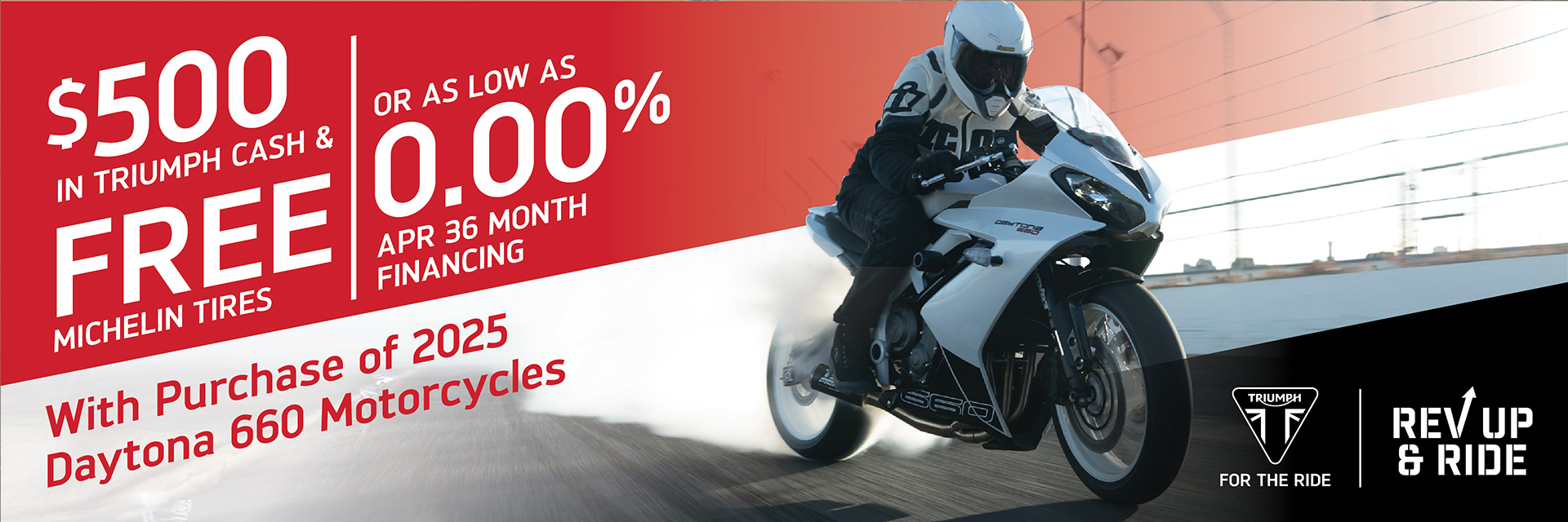 The Rev Up & Ride promotion offers robust incentives for riders to start their riding season on a new Triumph motorcycle, with cash offers and low financing rates.